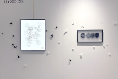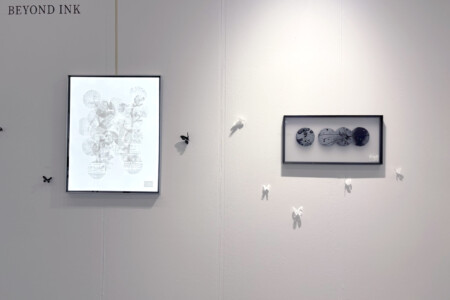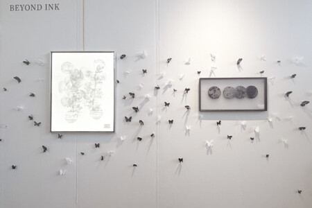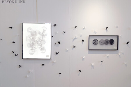 因此,曜畫廊不但將第一次的國際展會聚焦在德國,也在參展同時,提出一種感受來自台灣獨有創意與溫度的可能性——在展會上進行藝術家的現地創作,由楊忠銘親自將「無華之境」系列中,結合版畫原理、攝影、手工紙造紙術,歷經三年失敗才完成的蝴蝶創作《永恆的飛行》,以行為藝術的方式,展現在當地觀眾眼前。